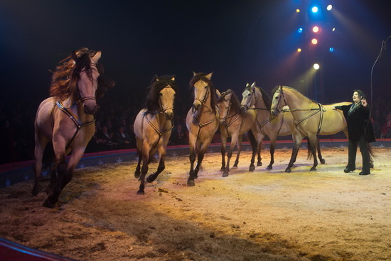 Gleich im Anschluss präsentiert ihre Mutter, Géraldine-Katherina Knie, sechs großrahmige Hengste mit golden schimmerndem Fell in einer flott ablaufenden Freiheitsdressur. Vielfältige Lauffiguren werden souverän dargeboten und einige erstklassige Steiger runden den Auftritt in gelungener Weise ab.