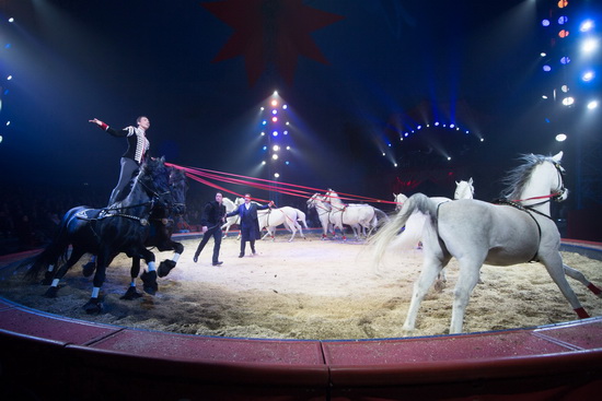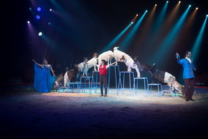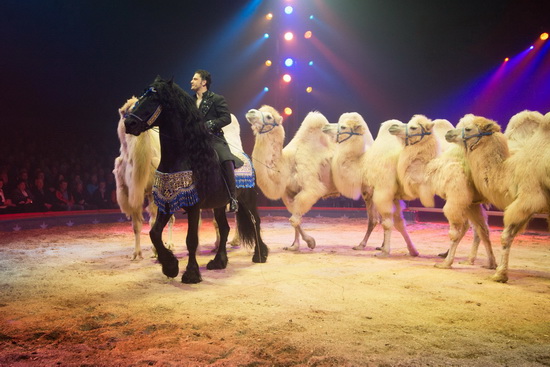 Wenig später sehen wir Maycol Errani sechs weiße Kamele vom Pferd aus vorführen. Schwungvoll und temporeich lässt der versierte Vorführer die verschiedenen Abläufe ausführen. Schließlich liegen die Trampeltiere in der Manege ab und mit einer gekonnten Levade auf dem überaus prächtig aufgeschirrten Friesen beendet der Tierlehrer den Auftritt.