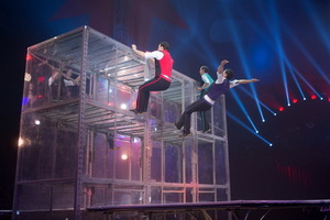 Der zweite Programmteil beginnt mit einer an der „Trampolinwand“. Drei Herren des „Spicy Circus“ agieren zusammen mit den drei Brüdern Errani auf den beiden großen Trampolinen zu beiden Seiten des aus Plexiglasplatten und Metallprofilen zusammengesetzten „Hauses“.