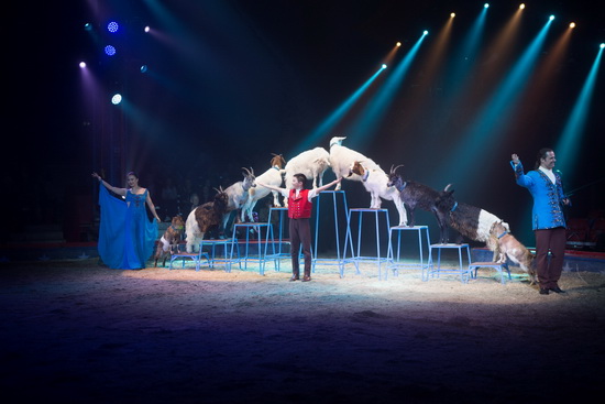 Franco Knie jun., seine Frau Linna und Sohn Chris-Rui präsentieren gemeinsam eine Ziegen-Revue. Mit der Projektion einer Elefantensilhouette auf einer Leinwand im Artisteneingang nimmt die Nummer ihren – freundlich ausgedrückt – befremdlichen Beginn. Dann nehmen die zwölf Ziegen unterschiedlicher Rassen ihre Plätze ein und arbeiten routiniert die erlernten Tricks.