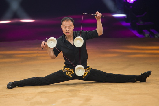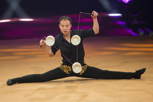 Eine rasante Diabolo-Jonglage präsentiert Chu Chuan-Ho. Viele hochkarätige Tricks des Genres erfolgen in hohem Tempo und erstklassiger Ausführung. Abschließend lässt der taiwanesische Artist drei Diabolos rotieren während er langsam in den Spagat gleitet.