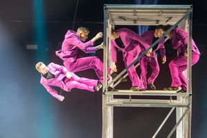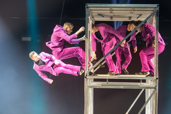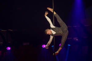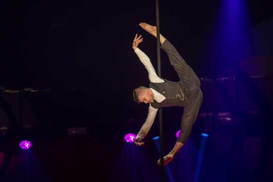 Einen weiteren Luft-Act bietet Denys Zhygaltsov am „Flying Pole“. Kraftvoll präsentiert der junge Mann die verschiedenen Haltefiguren an der schwebenden und schwingenden Stange. Mit Begeisterung und ungläubigem Staunen reagieren die Zuschauer auf die vielfältigen und anspruchsvollen Aktionen.