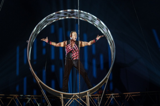 Nach dem temporeichen Beginn der Show folgt der eher ruhige und poetische Auftritt von Oksana Pylypchuk am Luftring. Zusammen mit Gitarrist Vladimir Matvichuk kommt die Artistin im eleganten roten Kleid auf die Bühne. Der Musiker stimmt „Lady in red“ an und die Artistin schwebt träumerisch wirkend in die Zeltkuppel, wo sie gekonnt ihre Evolutionen darbietet.
