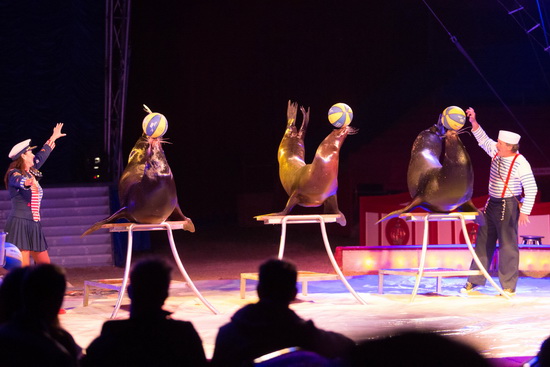 Drei Seelöwen und Terrier „Maylo“ folgen Petra und Roland Duss in den roten Ring. Die spektakuläre Spitzendarbietung bietet Tempo, Originalität, Trickreichtum, Präzision, Ausstrahlung und Esprit. Einzigartige Tricks, wie z. B. der Ritt des Hundes auf einer Robbe, selbständiges Kopfballspiel zweier Robben miteinander, weiterreichen eines Balles über alle Schnauzen und zurück und einige andere mehr, werden perfekt ausgeführt.