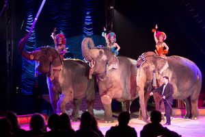 James Puydebois bringt die Wappentiere des Hauses Krone in den roten Ring. Drei asiatische Elefanten, mit Figurantinnen beritten, zeigen in einem tiergerechten Ablauf ihr erlerntes Können. Kopfstand, Hochsitzer und Pyramide sind die akrobatischen Tricks in diesem Elefantenballett.