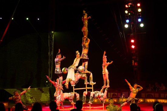 Die Truppe Khadgaa präsentiert eine eindrucksvolle Melange aus Kraftjonglage und Handvoltigen, die mit folkloristischen Elementen dargeboten wird. Markanter Kehlkopfgesang eines Truppenmitgliedes begleitet die in stetem Wechsel der beiden Genres ablaufende Trickfolge. Die Voltigeusen fliegen bis hinauf zum Vier-Mann-Hoch und in weitem Bogen von einem zum anderen Porteur. Schwere Metallkugeln werden scheinbar ohne Anstrengung jongliert, gewaltige Hantel umhergewirbelt und schließlich demonstriert der junge Koloss nachdrücklich seine Kraft, indem er eine Konstruktion, an der vier schwere Metallkugeln hängen und auf der vier Truppenmitglieder Platz nehmen, nur mit seinen Zähnen hochhebt. Zwei Untermänner stehen rücklings in der Brücke und auf ihren Körpern errichtet die Truppe eine hohe menschliche Pyramide.