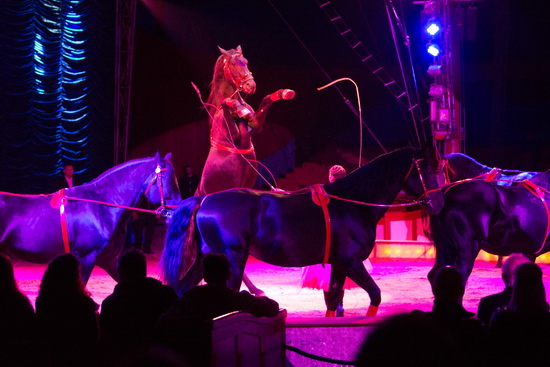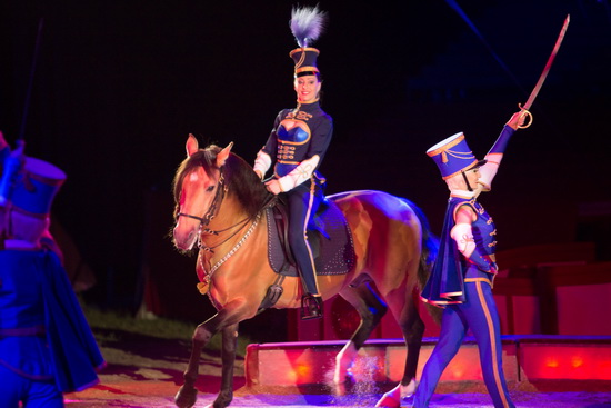Zunächst präsentiert Jana Mandana einen Zehner-Zug Schimmelhengste. In ruhiger Gangart erfolgen die unterschiedlichen Lauffiguren. Alsbald füllen zehn dunkelbraune, dekorativ mit roten Geschirren aufgezäumt, großrahmige Hengste die Manege und zeigen ihr erlerntes Können. Einige Da Capo Steiger runden den Auftritt ab.