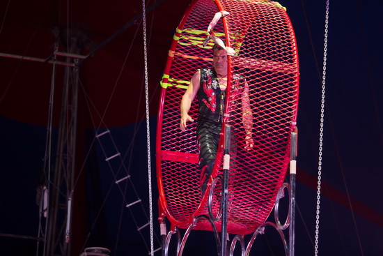 Auf einem schweren Motorrad kommt Crazy Wilson in den roten Ring und enthüllt, unterstützt von zwei Tänzerinnen, das riesige „Motorrad“ in der Kuppel. Mittels aufwändiger Verkleidung vermittelt das Todesrad die Illusion eines schweren Bike. Nachdem die Verkleidung des vorderen Kessels entfernt ist, ohne das der Artist auch nur einmal des Effekts wegen, das „Bike“ bestiegen hätte, arbeitet Wilson seine bekannte Trickfolge. Drei Saltos auf der Außenbahn des Rades sind der umjubelte Höhepunkt der Darbietung.