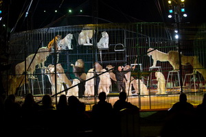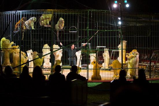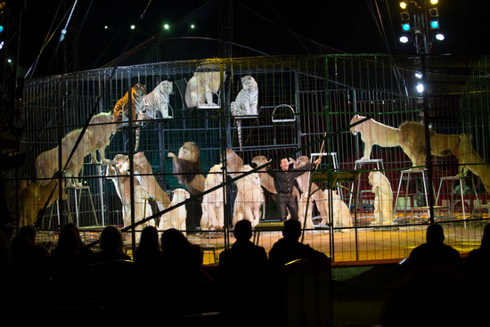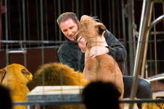 Den eindeutigen Höhepunkt der Show erleben wir nach der Pause mit Martin Lacey jun. großer Raubtiergruppe. Sechsundzwanzig Tiere – normalfarbene und weiße Löwinnen und Löwen sowie zwei weiße und ein normalfarbener Tiger - vereint der charismatische Dompteur in einer mitreißenden Dressurfolge. Mit einer eindrucksvollen Pyramide aller Tiere nimmt der Auftritt Fahrt auf. Großartig und effektvoll der Anblick von zweiundzwanzig in einem vollendeten Kreis um dem Tierlehrer hochsitzenden Löwen. Scheinangriffe eines Löwenmannes, Teppich, verschiedene Sprungvarianten und Schmuseszenen sind weitere Elemente dieser außergewöhnlichen Dressurschöpfung. Vier Löwen liegen auf dem am Boden liegenden Dompteur ab, decken ihn mit ihren Körpern zu. Der Sprung einer Löwin führt über den sich niederwerfenden Tierlehrer hinweg und ein Tiger zeigt einen hervorragenden Hinterbeilauf. Mit enormem Sprungvermögen „erjagt“ ein weiterer Tiger ein hoch über der Manege an einem Haken baumelndes Stück Fleisch. Martin Lacey hat eine Dressurgruppe zusammengestellt, wie man sie in Größe und Trickreichtum leider fast nicht mehr geboten bekommt. Chapeau.