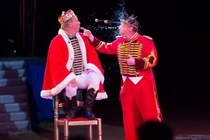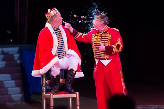 Fumagalli und Daris erobern die Manege zu ihrem ersten Entree. Mit flotten Sprüchen und Klamauk werden die Kaskaden auf und über einen Tisch von den beiden Erzkomödianten gewürzt.