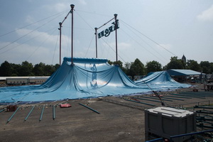 Der kleinere Platzteil, bei anderen Veranstaltungen dient er als Parkplatz, füllt sich mit den Wohnwagen der Artisten und Mitarbeiter und die in zwei langen Reihen stehen die mächtigen Zugmaschinen aufgefahren.