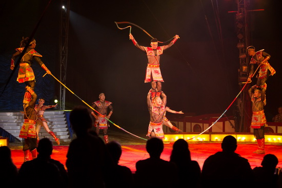 Die Truppe Khadgaa startet die Spielfolge mit Seil springen. In vielerlei Formationen und sich ständig steigernden Schwierigkeitsgrad werden die rhythmisch geschwungenen Taue übersprungen. Im zweiten Programmteil präsentiert die Truppe ihre eindrucksvolle Melange aus Kraftjonglage und Handvoltigen. Markanter Kehlkopfgesang eines Truppenmitglieds begleitet zusammen mit den Klängen einer Pferdekopfgeige die wechselweise stattfindenden Aktionen der beiden Genres. Bis zum Vier-Mann-Hoch werden die Voltigeurinnen katapultiert und weite Flüge zwischen den Porteuren erfolgen in verschiedenen Varianten. Schwere Hanteln werden scheinbar mühelos jongliert und eine Konstruktion, an der vier schwere Metallkugeln hängen und auf der vier Truppenmitglieder Platz nehmen nur mit den Zähnen angehoben. Schließlich errichtet die Truppe eine hohe, Pyramide aus menschlichen Körpern auf zwei in der Brücke stehenden Untermännern.