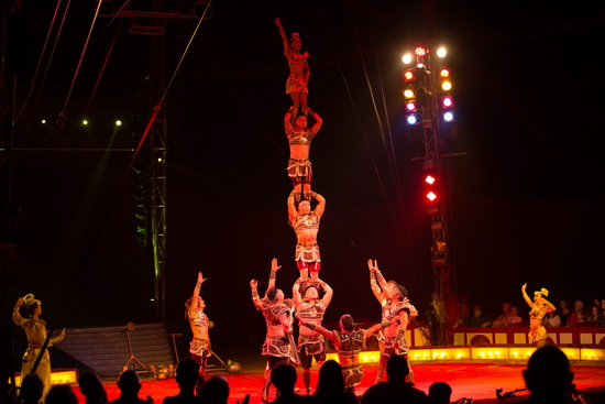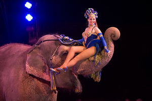 In der besuchten Abendvorstellung brachten Jana Mandana und James Puydebois Einzelelefant „Bara“ in den roten Ring. Gemächlich schreitend arbeitet die mächtige asiatische Elefantenkuh ein umfangreiches Trickrepertoire bis hin zum Kopfstand.