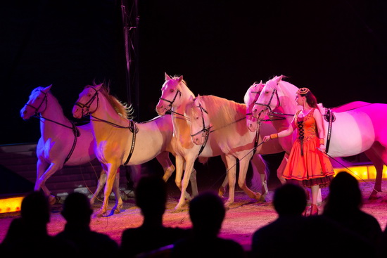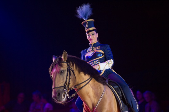 Das umfangreiche Bild der Pferdevorführungen bietet den einzigen Auftritt des Balletts außerhalb von Opening und Finale. In Husarenuniformen tanzen die Girls auf der Bühne und Showtreppe und geben der Hohen Schule, die Jana-Mandana auf einem golden schimmernden Ross gekonnt reitet den passenden Rahmen. Souverän und elegant präsentiert sich das Paar zu Radetzky- sowie Hoch- und Deutschmeistermarsch.