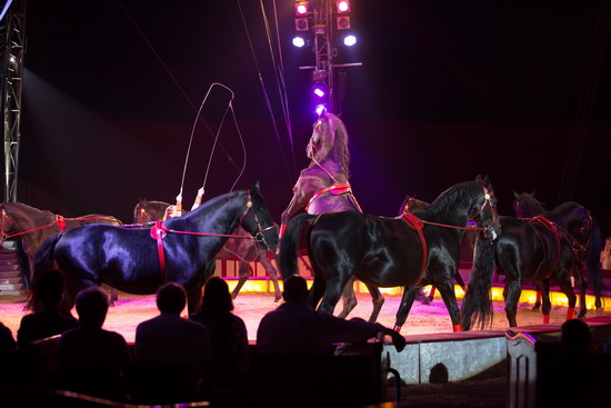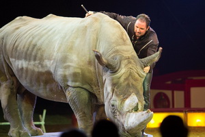 Flugs wird der Zentralkäfig entfernt und die Exotenkarawane in Gestalt von fünf, von Tänzerinnen geführten Lamas umrundet die Manege. Jana Lacey-Krone wendet sich derweil mit dem Appell an die Besucher mit einer Spende den Verein „Go for Rhino“ zu unterstützen, der sich mit seiner Arbeit für den Erhalt der gefährdeten Tierart Rhinozeros einsetzt.