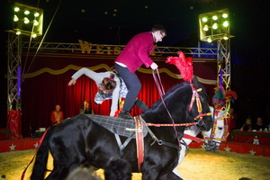 Das Pferdegespann steht bereit und Manegensprecher Tim Thomsen annonciert die kommende Nummer, doch die Artisten erscheinen einfach nicht. So ergreift denn ein ein wenig naiv wirkendes Paar die Chance zu Manegenstars zu avancieren und schon nimmt das komische Pas-de-Deux von Joe Spindler und Marie Navratilova Fahrt auf. Gekonnt ungelenk geben die beiden vor nicht stehend reiten zu können und sorgen mit ihren zahlreichen Aktionen für Heiterkeit auf den Rängen.