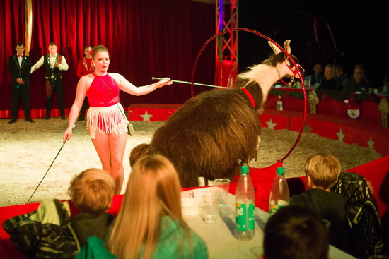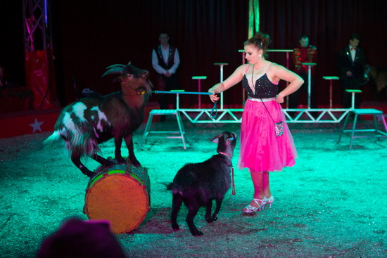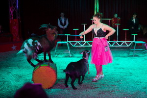 Wenig später folgt eine muntere Ziegenrevue, in der die Tiere u.a. über einen Balken laufen und sich auf einer Rolle fortbewegen. Zwei Minischweine sind im Rahmen des Auftritts gleichfalls kurz im roten Ring präsent und zum Da Capo erobert eine Schar Laufenten die Manege.