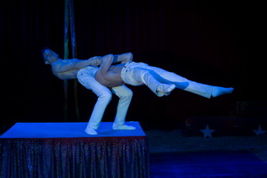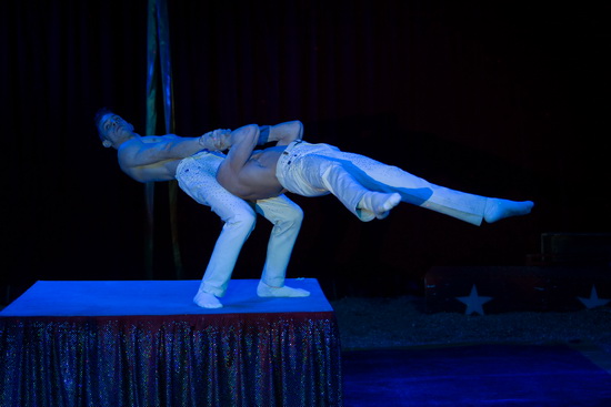 Noch einmal hoch hinaus geht es vor der Pause mit Bohumila Navratilova und Alexej Solomin und ihrem Perche-Act. Auf der Spitze der schweren hohen Stahlstangen, die vom Untermann auf Stirn und Schulter balanciert werden, präsentiert die junge Frau eine Reihe attraktiver Aktionen.
