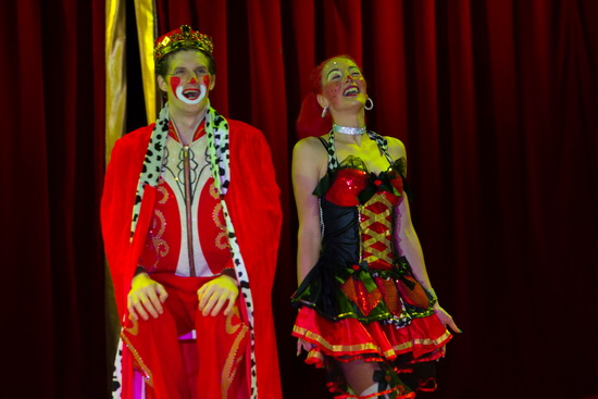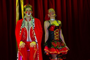 Erstmals steht Jasmin Quaiser gemeinsam mit ihrem Partner David Weisheit als Clownesse in der Manege. Ihre entwaffnende Fröhlichkeit wirkt ansteckend und die Freude am Spiel ist der sympathischen jungen Frau – die in verschiedenen schrill bunten und aufwändig gestylten Outfits die Szenen aufmischt - in jedem Moment deutlich anzumerken. Zunächst begeben sich die beiden mit Mitspielern auf die „Reise nach Jerusalem“, wobei an diesem Abend auch ein weit über die Region hinaus bekannter Puppenspielr mit auf die Reise ging. Im großen Entrée wird das „Bienchen“ gespielt. In ihrer straff gefassten und flott ablaufenden Version des Manegenklassikers ist Jasmin Quaiser die „kleine Arbeitsbiene“, die sich redlich abmüht der „Bienenkönigin“ Dave „Honig“ zu liefern, derweil Tim Thomsen den seriösen Part inne hat. Hier hat sich eine wahre Augustine des Herzens offenbart.