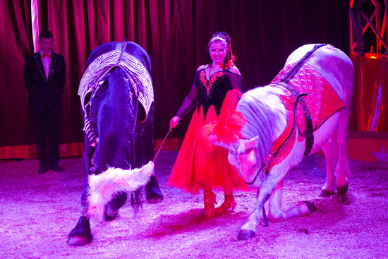 Dritte Darbietung ist eine interessant ablaufende Pferdefreiheit. Ein Schimmel-und ein Rapphengst laufen zunächst ihre Figuren, dann bieten der Rappe und ein schwarzes Shetland-Pony ein Groß-und-Klein. Nach einigen Touren wechseln die Tiere erneut und nun ist der Schimmel zusammen mit einem weißen Pony als Groß-und-Klein zu sehen.