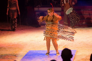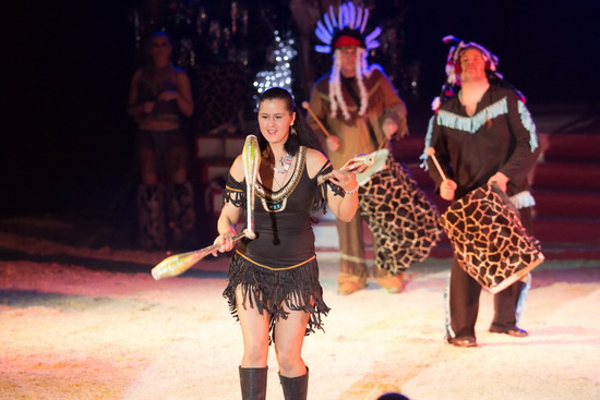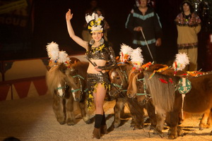 Das Programm beginnt mit einem großen indianischen Schaubild, in das viele Artisten eingebunden sind. Unter dem Klang dumpfer Trommeln zieht die Truppe in die Manege und startet ihr abwechslungsreiches Spiel. Desirée Köllner jongliert mit Keulen, Jezahel Pirlo bietet einige Kontorsionen und Miss Ashley lässt die Hula Hoops kreisen derweil Ali Bayar einen Requisiteur „skalpiert“. Ramona Spindler präsentiert ihr Können am Vertikalseil und alle Artisten treten mit den Bolas in Erscheinung. Der elfjährige Julian Bossert hat in dieser Spielzeit sein Manegendebut und präsentiert eine Einzelfreiheit. Das bunte Bild mündet in die Ponyfreiheit von Juniorchefin Ann-Katrin Bossert.