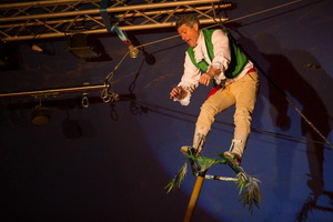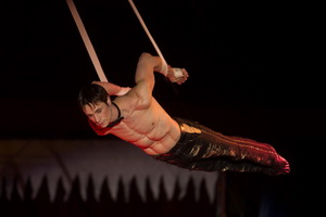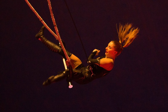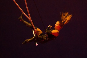 Für Nervenkitzel sorgt Laurie Vatan mit ihrer temperamentvollen Arbeit am Schwungtrapez. Zahlreiche Pirouetten und risikoreiche Abfaller werden von der zierlichen Artistin longengesichert in Perfektion ausgeführt.