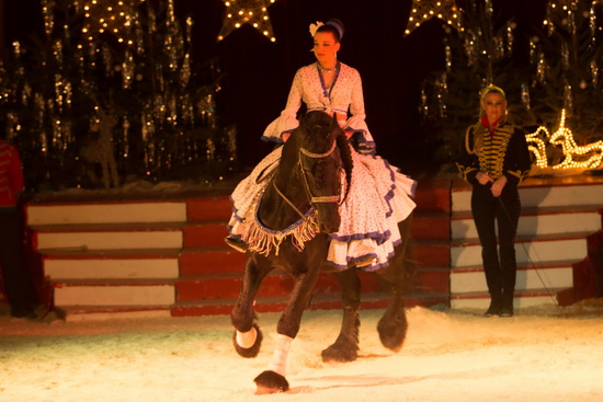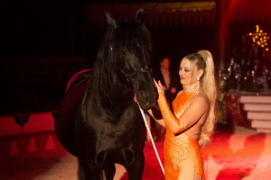 Komplettiert werden die Dressur-Darbietungen mit einer Hohen Schule, die Ann-Katrin Bossert auf Ramona Spindlers Friesenhengst „Marcho“ reitet. Im spanischen Look absolviert die Juniorchef anmutig die verschiedenen Lektionen. Gekonnt werden die starken Trabaktionen gearbeitet und mit spektakulären Steigern unter dem Sattel erreicht der Auftritt seinen Höhepunkt.