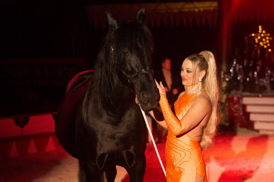 Ramona Spindler präsentierte den prachtvollen Andalusier-Rapphengst „Zorro“. Temperamentvoll zeigte sich der feurige Hengst in seiner ganzen Schönheit. Erstklassige Steiger und eine Manegenrunde im Spanischen Tritt absolviert er bravourös. Tiefes durchstecken des Kopfes zwischen den Vorderhufen wird auf einem Podest erstklassig ausgeführt und das auch Pferde lachen können zeigt Zorro ein ums andere Mal.