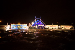 Auf dem Festplatz der Stadt empfing und der festlich beleuchtete schmucke Circus. Der kunstvoll mit Airbrushmotiven verzierte Kassenwagen bildete zusammen mit dem attraktiven Frontzaun und einem großen Eingangsportal, geschmückt mit dem beleuchteten Namen "Aeros" eine äußerst einladente Fassade. Direkt stand die neueste Investition der Familie - ein prächtiges neues Zelt. Der hohe mächtige Zweimaster mit spitzer Kuppel hat einen rechteckigen Grundriss und diente hier als gemütlich-geräumiges Foyerzelt. Gleich dahinter hat das bekannte Vier-Masten-Chapiteau seinen Platz.