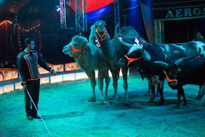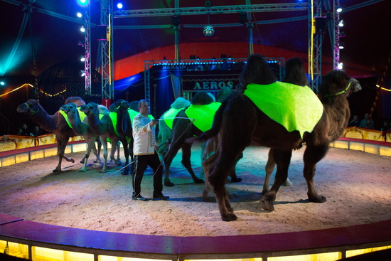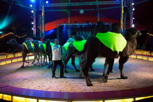 Meisterdresseur Don Medrano, alias Adi Schmidt, präsentiert in einem neu geschaffenen Dressur-Act vier Steppenkamele im Zusammenspiel mit vier Dromedaren. Die Schabracken der Trampeltiere leuchten im Schwarzlicht, während der souveräne Dresseur die vielseitigen Abläufe gekonnt ausführen lassen. Ruhig und sich selbst zurücknehmend dirigiert er die Tiere mit sparsamen Gesten zu den variantenreichen Lauffiguren.
