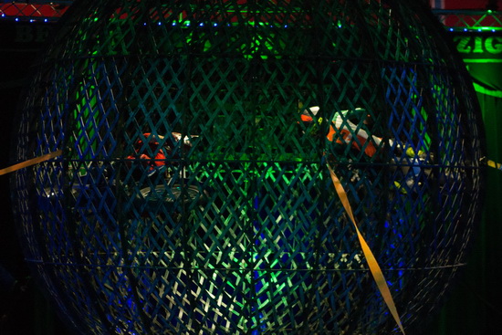 Dank des großen Improvisationskönnens und Arbeitseinsatzes der Familie Schmidt war es dem Publikum vergönnt die „Crazy Moto Company“ im Globe of Death zu erleben. Die verwegenen Motorradartisten Victor Robayo und Robinson Loiza donnern auf ihren Maschinen durch die relativ kleine Stahlgitterkugel. Rasante Loopings und Höllenritte auf kreuzenden Bahnen lassen den Zuschauern den Atem stocken. Zum Höhepunkt geht es immer abgedunkelten Zelt nur im Schein der LED-Bändern an den laut dröhnenden Maschinen durch den Globe.