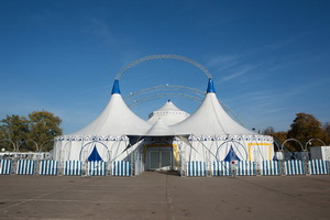 Siebzehn Reihen Einzelklappsitze füllen das Chapiteau vollkommen aus. Lediglich der Bereich des schmalen Artisteneingangs aus blauem Samt bleibt ausgespart. Auf dessen Empore nimmt Orchesterleiter Kristof Majewski mit seinen acht Musikern Platz. Dieser vorzügliche Klangkörper unterstützt die auftretenden Artisten in eindrucksvoller Weise.