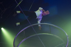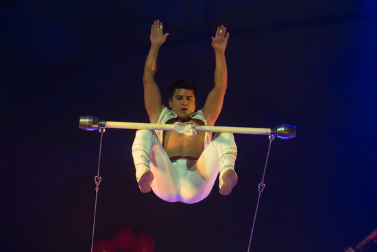 Alain Alegria arbeitet seine trickstarke und risikoreiche Nummer auf dem Washington-Trapez mit cooler Attitüde. Ohne jegliche Sicherung erfolgen die risikoreichen Tricks hoch in der Kuppel. Freihändigen Balancen auf dem weit ausschwingenden Trapez sowie auf einem mit zwei Beinen auf der Trapezstange stehenden Stuhl sitzen und stehen wird getoppt von der Aufnahme eines Tuches mit dem Mund im vollen Schwung, wobei der Artist für einen kurzen Moment völlig frei im Raum schwebt.