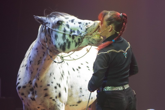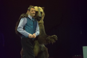 Pavel Vyakin und sein Bär „Tima“ faszinieren immer wieder aufs Neue. Völlig alleine in der Manege, der Vorführer tritt bis hinter den Vorhang zurück, zeigt der große prächtige Bär sein Können. Er entlockt einem einer Fanfare ähnlichen Musikinstrument Töne. Einen leichten, auf dem Kopf stehenden Kunststoffsessel dreht er blitzschnell in die richtige Position und nimmt gelassen darauf Platz, was angesichts seines Umfangs zunächst unmöglich schien. Einen gereichten Hula Hoop Ring stülpt er sich gewandt über den Kopf und versetzt ihn völlig selbständig in Rotation.