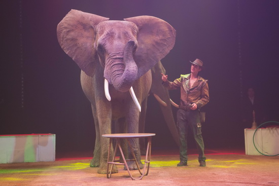 Auch die beiden afrikanischen Elefanten beherrschen ein umfassendes Repertoire. Neben Laufarbeit und verschiedenen akrobatischen Übungen, wie z. B. hochsitzen, geht es auch spielerisch zu, wenn beispielsweise Rechenaufgaben gelöst werden. Effektvoll wird das enge Vertrauensverhältnis des Dompteurs zu seinen Schützlingen demonstriert, indem ein Elefant seinen Fuß nur wenige Zentimeter über den Kopf des liegenden Dompteurs hält und anschließend über ihm abliegt.