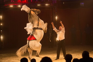 Getreu dem Motto „Le Cirque commence au Cheval“ beginnt die Nummernfolge mit den elegant vorgeführten Freiheitsdressuren von Alexander Scholl. Zunächst laufen zwei prächtig herausgeputzte Friesen ihre Figuren. Ein Groß-und-Klein eines Friesen und eines schwarzen Shetland-Ponys schließt sich unmittelbar an und ein weißer Araber zeigt sich als formidabler Steiger. Acht muntere Schecken-Ponys komplettieren mit ihren abwechslungsreichen Lauffiguren den Block der Pferdedressuren. Im zweiten Programmteil präsentiert Alexander Scholl vier Steppenkamele. Die Trampeltiere tragen dekorative rote Schabracken mit goldfarbenem Dekor. Als Da Capo zeigen sich drei Lamas als geschickte Barrierenspringer.