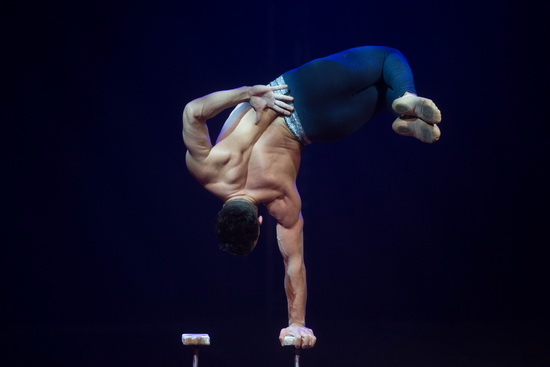 Adil Hajji hat seine Handstandequilibristik verträumt-romantisch gestaltet. Nach ausführlicher Einleitung erfolgen die unterschiedlichsten Handstände auf Handstäben, die in einem flachen Rahmen auf dem Manegenteppich ruhen.