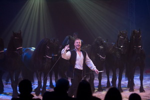 Marlon Zinnecker eröffnet mit der Freiheitsdressur von acht Friesen die Nummernfolge. Souverän lässt der sympathische Tierlehrer die vielfältigen Figuren ablaufen. Pirouetten, Volten, Fächer, Gegenläufe und andere Figuren werden in perfekter Manier ausgeführt. Als Da Capo präsentieren drei weiße Araber eine Reihe unterschiedlicher hervorragender Steiger.