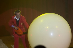 Der erste Auftritt gipfelt im einhändigen Trompetenspiel des Clowns, während er im Kopfstand auf einer stabilen Puppe steht. Ein andermal kommt, nachdem einige Luftballons zerstört wurden, ein überdimensionaler Luftballon zum Einsatz, in dessen Innerem der Clown schließlich in bekannter Weise seine Späße treibt.