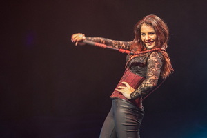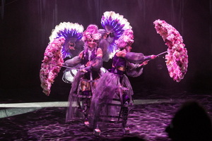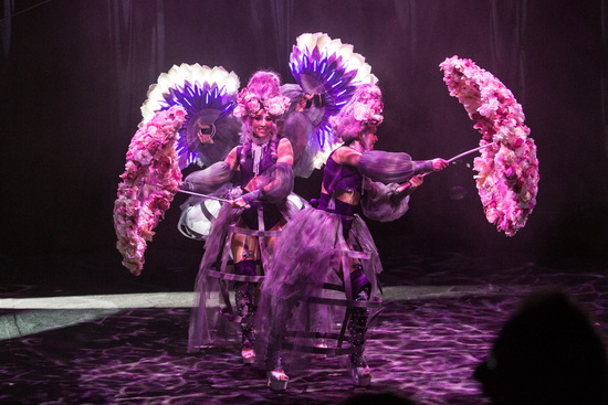 Angelica Vargas beherrscht das Spiel mit den Bull-Peitschen in Perfektion. Zeitungsseiten werden geteilt und in kleine Schnipsel zerlegt und umher geschwungene Bänder immer wieder durchtrennt. Papierblumen finden ein jähes Ende durch die kräftig geschwungene Peitschenschnur. Einige der Ziele hält die Artistin dabei in der eigenen Hand, bzw. zwischen den Lippen und auch ein Besucher darf seinen Mut beweisen.