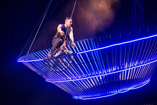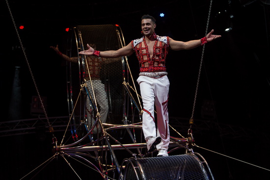 Die an Luft-Darbietungen reiche Nummernfolge nimmt ihren Beginn folgerichtig in der Kuppel. In einer großen, trichterförmigen hölzernen Konstruktion dreht Sonny Gärnter auf einem Fahrrad seine Runden. Schon bald wird der mittlere Boden entfernt, so dass er im offenen Trichter kräftig in die Pedale treten muss um sich in der Schräge zu halten.