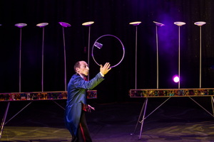 Lajos Nereus präsentiert seine erstklassige Tellerjonglage. Mit großer Manegenpräsenz und in hohem Tempo agiert der versierte Artist und baut eine Reihe „Nebenschauplätze“ in den turbulenten Ablauf ein. Ein Glas mit Wasser wird in einem Metallreifen manipuliert – was natürlich zunächst nicht gelingt. Dann werden vier Eier durch wegschlagen ihrer Auflage in Gläser platziert, die auf einem Tablett an der Spitze einer Stange hoch über der Stirn den Jongleurs stehen. Schließlich rotieren die anvisierten zehn Teller auf ihren Stangen und die Glas-Manipulation gelingt.