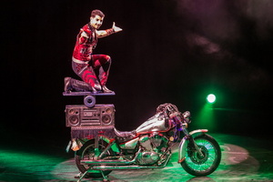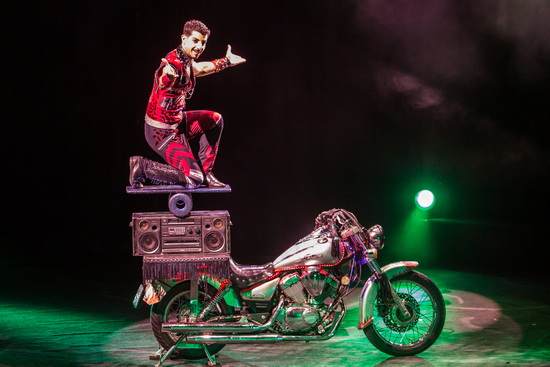 Auf einem schweren Motorrad präsentiert Kevin Chaves sein Können auf der Rola Rola. Ein Rückwärtssalto auf dem Rollbrett ist ein erstes Highlight des Auftritts. Er balanciert auf einem Basketball und im Handstand. Vier Skateboards ruhen auf der Rola und schließlich hält der junge Mann auf einem hohen Turm aus zwei Rollen und fünf Zwischenlagen souverän die Balance.