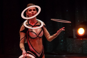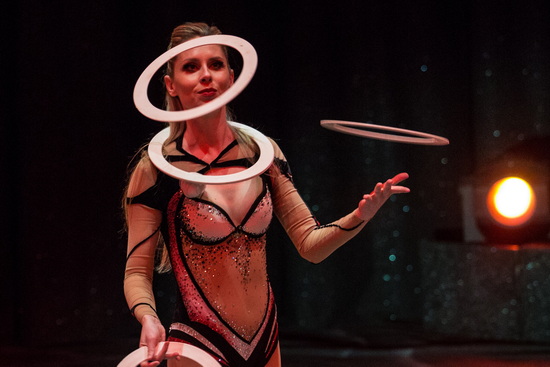 Mit fünf weißen Ringen beginnt Jongleur Elena Gambi ihren Auftritt. Bald wechselt sie die Requisiten und die folgenden Touren werden mit drei Tennisbällen absolviert. Nach und nach fügt sie weitere Bälle, die in Klammern an ihrem Kostüm befestigt sind, in die Routinen ein und schließlich sind deren sieben die in der Luft gehalten werden.