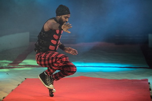 Gekonnte Einrad-Akrobatik bot ein dunkelhäutigen Artist. Nach ersten Touren auf einem normalen Einrad folgte ein hohes Gefährt bei dem drei Räder übereinander angeordnet sind und die Kraftübertragung zur Fortbewegung einzig von den aufeinander reibenden Rädern kommt. Abschließend präsentiert der sympathische junge Mann eine Fahrt auf einem geradezu winzigen Einrad. Laufrad und das darüber angeordnete Tretlager sind zusammen vielleicht zehn Zentimeter hoch und die Sattelstütze hat etwa fünfundzwanzig Zentimeter Länge.