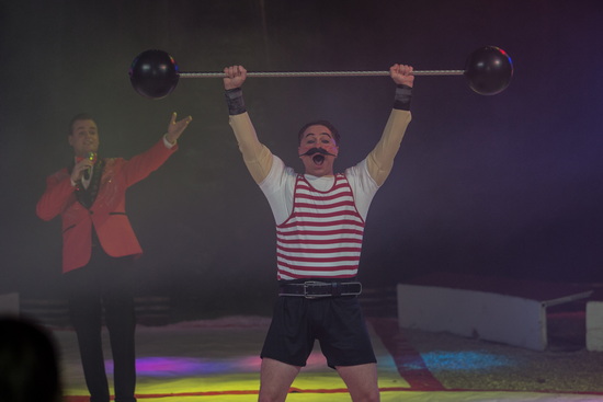 Clown Jason Medini ist im Re-Engagement für den Frohsinn in der Show zuständig. Diese Mal sehen wir als „starken Mann a la 1900“. Schwerste Eisenkugel werden manipuliert und Hanteln gestemmt. Schließlich dienen Boule-Kugeln als Jonglage-Requisiten – das Ende ist bekannt. Im zweiten Programmteil bittet er vier Herren auf vier Stühlen Platz zu nehmen.