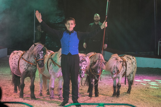 Alexandro Renz, ältester Enkel von Direktor Franz Renz, ist mit sechs dekorativen Tigerscheck Ponys in der Manege zu erleben. Die Kleinpferde beherrschen ihr erlerntes Repertoire und der jugendliche Tierlehrer dirigiert den Ablauf souverän.