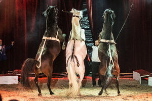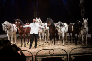 Selbstverständlich darf die exzellente und elegante Pferdefreiheit mit je vier braunen und weißen Araberhengsten unter der gekonnten Peitschenführung von Franz Renz jr. nicht fehlen. Harmonisch reiht der versierte Tierlehrer die abwechslungsreichen Volten, Gegenläufe und Pirouetten aneinander. Eine umfassende Auswahl unterschiedlicher, erstklassig ausgeführter Steiger rundet den Auftritt eindrucksvoll ab.