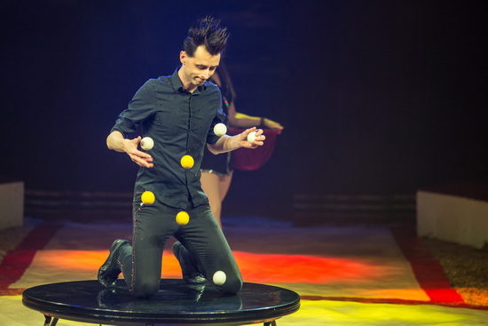 Die großartige Bodenjonglage von Alan Sulc wurde, völlig zu Recht, als Finalnummer aufgeboten. Mehr als zwei Jahrzehnte ist der sympathische junge Mann nun mit seinem herausragenden Act in vielen großen Manegen und auf bedeutenden Festivals zu erleben und stets begeistert er sein Publikum. Zu Irish Folk Klängen tanzt der Jongleur in hohem Tempo auf der kleinen Plattform und bis zu sieben Bounce-Bälle werden im Rhythmus der Musik manipuliert, finden mit traumwandlerischen Sicherheit immer wieder in seine Hände zurück. Die Routinen werden derart leicht und selbstverständlich ausgeführt, das der Auftritt einen ungeheuer spielerische Note ausstrahlt.