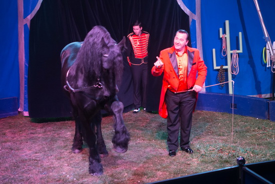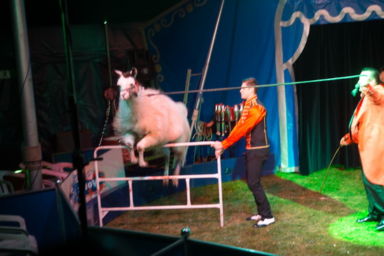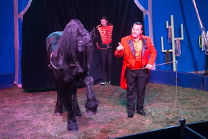 Verschiedene Tierdressuren werden zu Programmbeginn geboten. Der Friese „Toldeo“ eröffnet den bunten Reigen mit seinen verschiedenen Lauffiguren. Ihm folgt ein Esel, der sich durchaus als sprichwörtlicher Vertreter seiner Rasse zeigt. Barrierensprünge werden regelmäßig verweigert und blitzschnelles, gezieltes austreten gehört ebenfalls zu seinem Repertoire. Abschließend demonstriert ein Lama sein Sprungvermögen, indem es hohe Hürden fast aus dem Stand ohne große Mühen überwindet.